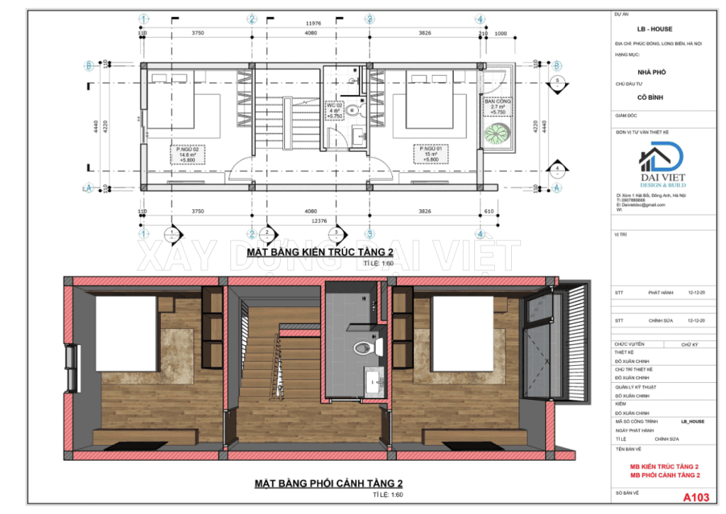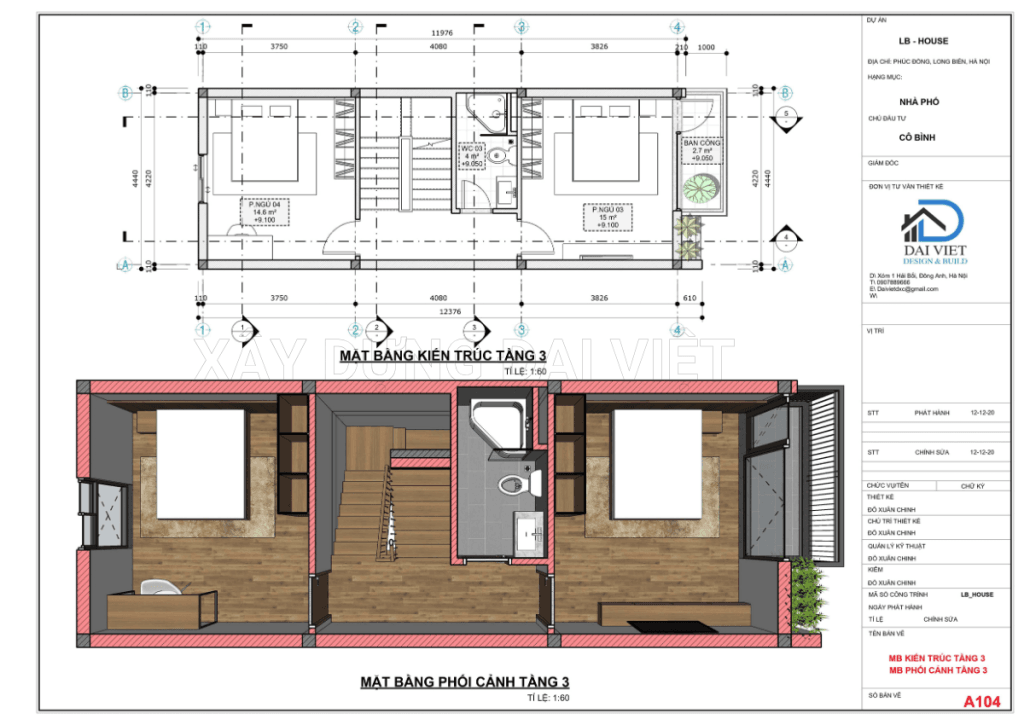 Tầng 2, Tầng 3: Bao gồm 2 phòng ngủ phía trước và phía sau, ở giữa được bố trí 1 phòng vệ sinh chung và cầu thang có giếng trời lấy ánh sáng và gió tự nhiên.